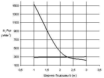 Строим графики зависимостей расчетного сопротивления (R) и фактического давления (Рср) от ширины подошвы b: