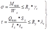 Проверяется прочность стенки на совместное воздействие σ и τ, расчетное сечение в трети пролета.