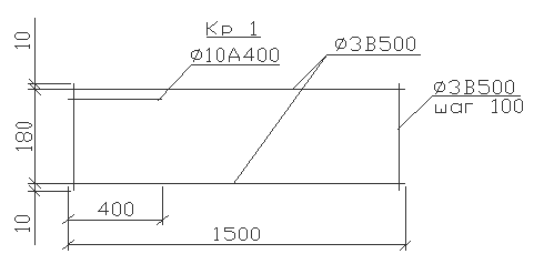 У концов плиты ниже напрягаемой арматуры устанавливаем горизонтальные корытообразные сетки для предотвращения трещин вдоль напрягаемых стержней в зоне анкеровки и их продергивания. Длина каждой сетки 400 мм, диаметр стержней сеток - 4 мм, шаг - 100 мм, защитный слой - 10 мм.