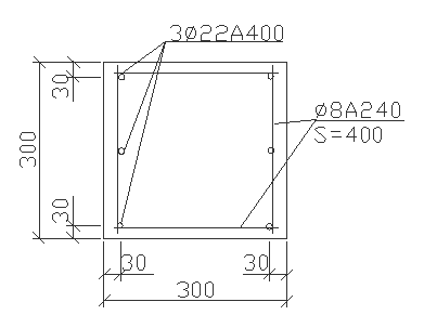 Поперечную арматуру (хомуты) устанавливаем без расчета. В сварных каркасах диаметр хомутов принимают равным 0,3 диаметра продольной арматуры(0,3*22 = 6,6 мм), шаг хомутов - не более 20 диаметров продольных стержней (20*22 = 440 мм), но не более удвоенной ширины колонны (2*300 = 600 мм) и не более 500 мм. Поперечную арматуру выполняем из стали класса А 240 Æ8 мм с шагом 400 мм.