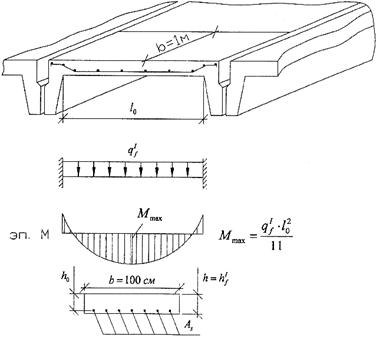 Полка панели считается защемленной в продольных рёбрах и свободно опёртой на поперечные торцовые рёбра. Поскольку отношение длинной стороны полки к короткой больше двух, то полка панели рассчитывается в направлении короткой стороны как балка шириной b=1 м с защемленными опорами (рис. 8).