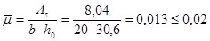 — коэффициент армирования сечения, принимаемый равным отношению площади сечения бетона (при рабочей высоте h0 и без учёта сжатых свесов полок), но не более 0,02