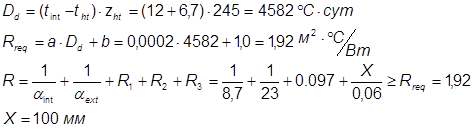Расчетные формулы, а также значения величин и коэффициентов приняты по СНиП 23-02-2003 «Тепловая защита зданий».