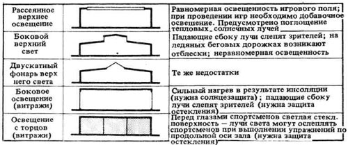 Естественное и искусственное освещение. Требуется равномерная освещенность, характеризуемая отношением E мин / E макс, согласно нормам DIN 5034 («Естественное освещение»); для всех видов игр с мячом требуется мягкое освещение. Освещённость мест для зрителей должна быть меньшей, чтобы игровое поле выделялось. Хорошее общее освещение (150 - 200 лк) при соревнованиях по боксу, борьбе, гимнастике, настольному теннису, фехтованию и т.п. должно дополняться местным направленным освещением (рис. 1).