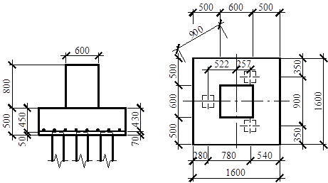 Размещаем сваи в плане таким образом, чтобы рассояние между их центрами было не менее 3d. Тогда размеры плиты ростверка в плане оказываются равными 1,6х1,6м. По высоте принимаем h=0,5м, высоту подколонника 0,8м (см. рис. 8.22.).