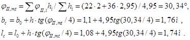 Проверку давления на грунт выполняем от условного фундамента ABCD (см. рис. 8.23.). определяем средневзвешенное значение угла внутреннего трения φIImt и размеры подошвы условного фундамента bc и lc соответственно по формулам 9,39[9] и 9,40[9], учитывая, что для отдельных слоев грунта толщиной hi, м, расчетные значения угла внутреннего трения φIIi, град (см. рис. 8.23.) и расстояния между наружными гранями крайних рядов свай b0=1,1м, l0=1,08м