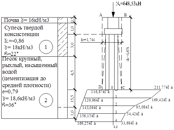Рис. 8.23 Расчетная схема к определению осадки свайного фундамента под колонну К2.