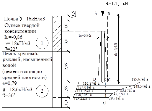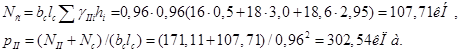 Вес условного фундамента Nc и давление на грунт по его подошве pII вычисляемпо формулам 9,41[9] и 9,42[9], используя значения удельного веса γIIi отдельных слоев грунта толщиной hi, в пределах глубины заложения условного фундамента dc (см. рис.8.24.) и нагрузку на фундамент II группы предельных состояний NII=NI/γf=205,33/1,2=171,11кН (где γf=1,2 – среднее значение коэффициента надежности по нагрузке),
