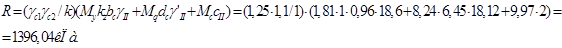 Расчетное сопротивление грунта R, расположенного ниже условного фундамента, определяем по формуле 4,8[9], принимая d=dc и b=bc и учитывая, что γс1=1,25 (табл. 4,6 [9]); γс2=1,0 (табл. 4,6 [9]);k=1; kz=1;My=1,81, Mq=8,24, Mc=9,97(для φII=36° несущего слоя табл. 4,7 [9]);bc=0,96м; γII=18,6кН/м3-удельный вес грунта, расположенного под подошвой условного фундамента; dc=6,45м;