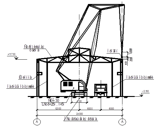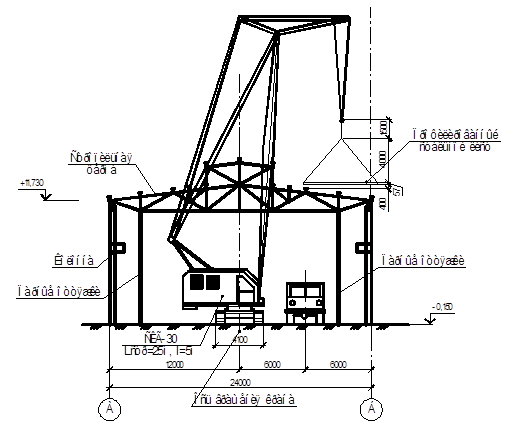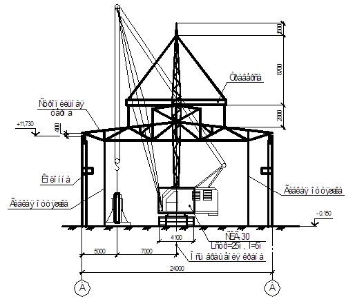 Монтаж конструкций здания первого этапа строительства осуществляется при помощи гусеничного крана CКГ-30 в башенно стреловом исполнении (Lстp = 25 м, lг = 5 м).