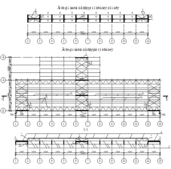 1 – вертикальные связи по колоннам; 2 – вертикальная связь фонаря; 3 горизонтальные связи покрытия; 4 - прогоны; 5 - распорки; 6 – фермы; 7 – фермы фонаря