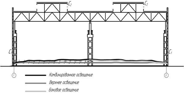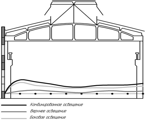 Построение кривых освещенности выполняется на поперечном разрезе. Вверх от каждой расчетной точки откладываются значения КЕО при верхнем, боковом и комбинированном освещении. Затем соответствующие точки соединяются плавной линией.