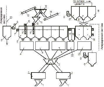 Рисунок 4. Технологическая схема приготовления бетонной смеси: 1 – воронка выдачи готовой смеси; 2 – бетоносмеситель; 3 – сборная воронка; 4, 21, 22 – двухфракционные дозаторы цемента, заполнителей, жидкости соответственно; 5,– расходные бункера заполнителей; 6 – фильтры; 7 – указатель уровня; 8 – вентиляторы; 9 – свободообрушители песка; 10 – вибраторы; 11 – поворотная воронка; 12 – двухрукавная течка; 13 – ленточный конвейер;14 – передаточный ленточный конвейер; 15 – циклон; 16 – улавливатель цемента; 20 – аспирационная система.