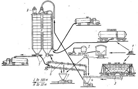 1–маневровая лебедка; 2–вакуумный разгрузчик; 3–винтовой конвейер с очистной секцией; 4–пневматический подъемник; 5–пневматический винтовой насос; 6–аэрожелоб; 7–донный разгружатель; 8–силоса; 9–камера осаждения с фильтром.