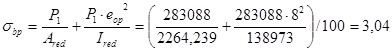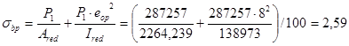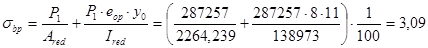Вычисляем сжимающее напряжение в бетоне на уровне центра тяжести напрягаемой арматуры от усилия обжатия Р1 (без учета изгибающего момента от веса плиты):
