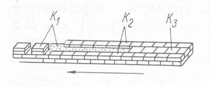 Кладку стен выполнять звеном «тройка». Каменщик К2 (4-й или 5-й разряд) кладет верстовые ленты, а подручный К3 (2-й разряд) – забутовку, каменщик К1 (2-й разряд) подает раствор и материалы (см. рисунок 10).