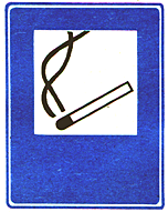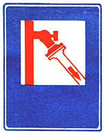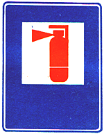 Указательные знаки предназначены для указания местонахождения различных объектов и устройств, пунктов медицинской помощи, питьевых пунктов, пожарных постов, пожарных кранов, гидрантов, огнетушителей, пунктов извещения о пожаре, складов, мастерских и должны быть следующими: синий прямоугольник, окантованный белой каймой по контуру, с белым квадратом внутри с нанесением символического изображение или поясняющей надписи.