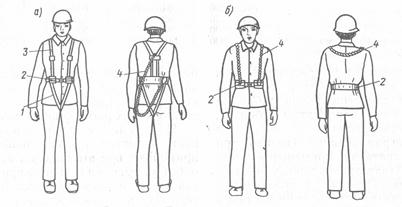 а – лямочные; б – безлямочные; 1 – ножные лямки; 2 – пояс; 3 – плечевые лямки; 4 – строп с карабином
