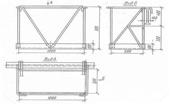 Безопасность работающих на высоте при приемке, установке, выверке и проектном закреплении конструкции обеспечивается применением средств коллективной защиты: приставными лестницами с рабочими площадками, люльками. На рисунке 23 показана односторонняя металлическая люлька на одного человека для обработки стыков примыкания балок небольшой высоты к колоннам.
