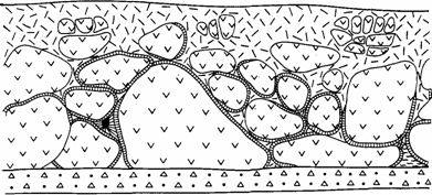 У контакта с подстилающими туфоалевролитами шаровая лава сложена плотно упакованными базальтовыми “подушками” размером 1,5—2 м. Затем упаковк-а блоков постепенно разрежается, и они приобретают эллипсоидальную или сферическую форму. При этом у крупных сфероидов появляется бурая мандельштейновая корка, а мелкие (размером до 0,5—0,8 м в поперечнике) иногда нацело сложены мандельштейном. Межглыбовое пространство заполнено тахилитовой дресвой, сцементированной кальцитом и цеолитами (рис. 2). Обломки тахилита имеют вогнуто-выпуклую форму и, очевидно, представляют собой разрушенные корки сфероидов. Особенно много дресвы содержится в верхней части линзы, где встречаются только редкие плоские глыбы мандельштейна. Выше шаровая лава сменяется плотным мандельштейном с крупными кальцитовыми миндалинами, за которым следует обычный мелкозернистый базальт.