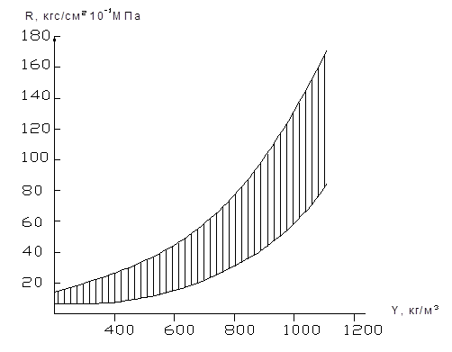 Зависимость прочности Rб газобетона от его объемной массы Y