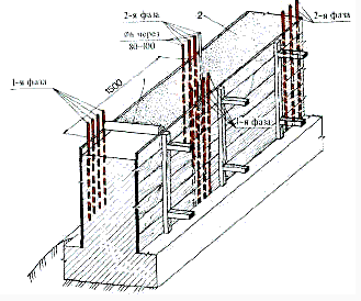 При групповом расположении нашивных электродов 1- толь; 2- опилки. Независимо от способа выдерживания кладки при положительной температуре (до приобретения ею заданной прочности) состояние основания, на которое укладывают бетонную смесь, а также способ ее укладки должны исключать возможность замерзания бетонной смеси в стыке с основанием. Слой старой кладки в месте стыка с новой должен быть отогрет до укладки бетонной смеси (температура не ниже +2 0С) и предохранен от замерзания до приобретения вновь уложенным бетоном требуемой прочности. В возведенной кладке контролируют температурный режим твердения бетона. Для этого в кладке оставляют гнезда с пробками, чтобы можно было измерить термометром температуру в середине кладки и у ее поверхности. Кроме того, контролируют прочность бетона по контрольным образцам.