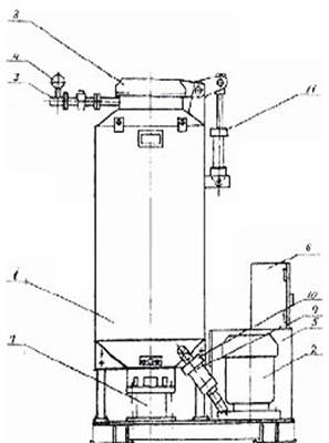 Рис.1 Схема баросмесителя: 1- баросмеситель; 2 - электродвигатель; 3 - воздуховод; 4 - манометр; 5 - защитный кожух; 6 - пульт управления; 7- вал; 8 - крышка; 9 - напорный кран; 10-штуцер; 11-рукоядка