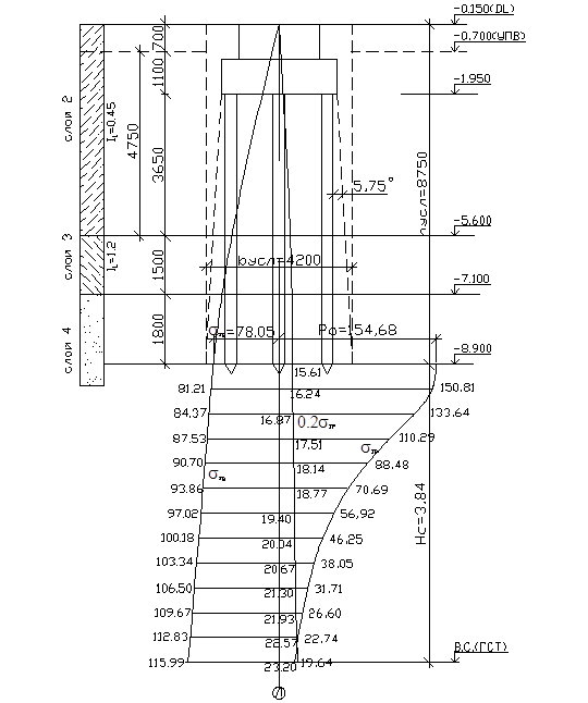 На глубине Hc = 3,84 м. от подошвы условного фундамента выполняется условие СНиП 2.02.01–83* (прил. 2, п.6) ограничения глубины сжимаемой толщи основания (ГСТ):