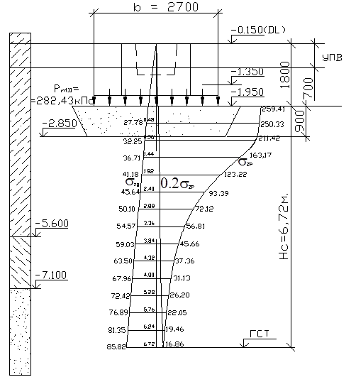 Граница распределительной подушки и верхнего слоя суглинка условна смещена до глубины zi = 0,96 м. от подошвы фундамента (фактическое положение на глубине z = 0,90 м.), граница верхнего и среднего слоев – до глубины zi = 3,84 м. (фактическое положение на глубине z = 3,8 м.), а граница суглинка и глины смещена до глубины zi = 5,23 м. от подошвы (фактическое положение на глубине z = 5,3). На глубине Hc = 6,72 м. от подошвы фундамента выполняется условие СНиП 2.02.01–83* (прил. 2, п.6) ограничения глубины сжимаемой толщи основания (ГСТ):