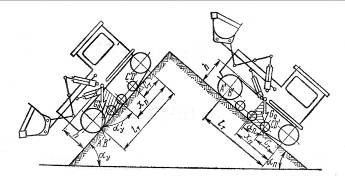 Продольную устойчивость погрузчика рассчитывают относительно передней и задней оси опрокидывания. Погрузчик располагают так, чтобы его продольная ось была перпендикулярна линии наибольшего склона.