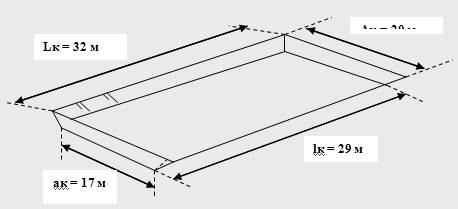 размеры по верху: 20X 32 (Ак = ак + 2b = 17+2*1,5 = 20 м; Lк = bк + 2b = 29+3=32 м)
