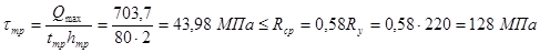 Высоту траверсы определяем из условия размещения четырёх швов крепления траверс к ветви. Сварка полуавтоматическая проволокой СВ08А ![]()