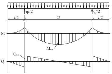 В двухконсольной балке при действии равномерно-распределенной нагрузки максимальный пролетный и изгибающий момент: