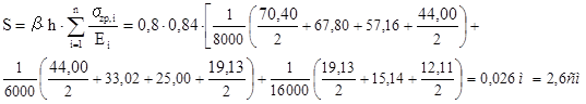 Граница глины и суглинка условно смещена до глубины zi = 3,36 м от подошвы (фактическое положение на глубине z = 3,35 м), а граница суглинка и глины смещена до глубины zi = 5,04 м от подошвы (фактическое положение на глубине z = 5,05). На глубине Hc = 6,72 м от подошвы фундамента выполняется условие СНиП 2.02.01-83 (прил.2, п.6) ограничения глубины сжимаемой толщи основания (ГСТ)