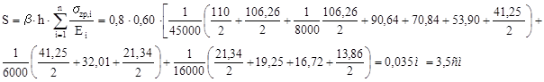 Граница глины и суглинка условно смещена до глубины zi = 3,00 м от подошвы (фактическое положение на глубине z = 3,35 м), а граница суглинка и глины смещена до глубины zi = 4,8 м от подошвы (фактическое положение на глубине z = 5,05). На глубине Hc =6,0 м от подошвы фундамента выполняется условие СНиП 2.02.01-83 (прил.2, п.6) ограничения глубины сжимаемой толщи основания (ГСТ) поэтому послойное суммирование деформаций основания производим в пределах от подошвы фундамента до ГСТ
