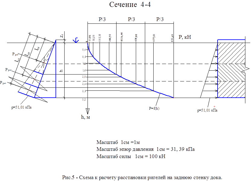 3) Отрезок MN делим на 4 равные части, из полученных точек восстанавливаем перпендикуляры до пересечения с кривой. Затем проводим линии на уровне полученных точек , которые поделят эпюру гидростатического давления на равные площади. Сила давления равна объему полученных равновеликих площадей и составляет: