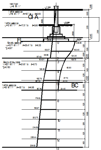 Расчёт фундамента по деформациям как условного массивного фундамента на естественном основании. Границы условного фундамента определяется следующим образом: сверху поверхностью планировки, с боков вертикальными плоскостями АВ и БГ, снизу плоскостью в уровне нижних концов свай в границах условной площади подошвы фундамента.