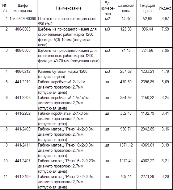 При этом, индексы на габионные конструкции оказались меньше нормативного индекса, индексы на инертные строительные материалы – больше.