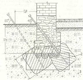 При строительстве многих зданий, особенно соборов, осуществлялась забивка коротких деревянных свай длиной около 1 м. Это позволяло уплотнить грунт на дне траншеи, затем засыпать ее камнем и залить известковым раствором. При строительстве Успенского собора в Москве в 1475—1479 гг. на мелких песках без перегноя архит. А. Фиорованти под всеми стенами забил деревянные сваи длиной 0,5 саж. Прошло 150 лет, сваи сгнили и стены получили значительные неравномерные осадки. При предварительных работах по закреплению грунтов в основании Успенского собора и расположенной рядом церкви Ризположения исследователи столкнулись с трудностями при инъекции закрепляющих растворов. Дело в том, что технология забивки инъекторов и закачки растворов, существующая до настоящего времени, пригодна при вертикальном или наклонном положении вводимых в грунт инъекторов и для грунтов с сравнительно большой проницаемостью. В практике химического закрепления все чаще приходится сталкиваться в малопроницаемыми грунтами и с условиями производства работ, когда вертикальная или наклонная забивка инъекторов по ряду причин невозможна. Именно такие условия и выявились на указанных объектах. В связи с этим была предложена схема горизонтального задавливания инъекторов в грунт, в основу которой заложен принцип продавливания труб при прокладке ряда трубопроводов и использование инъекторов с манжетным устройством.