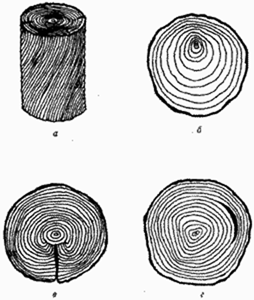 а - морозобоина; б - метиковые; в - отлупные; г - усушки.