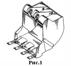 От выпадения зубья удерживаются шплинтами. Ребра придают ковшу необходимые прочность и жесткость. У ковша открыта только передняя часть, поэтому для разгрузки грунта или сыпучих материалов ковш поворачивают с помощью гидроцилиндра и тяг вокруг шарниров крепления к подвески.