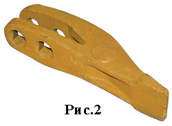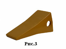 По сути, за последнее 30 лет, ковш не претерпел существенных конструктивных изменений. Некоторая эволюция прослеживается в изменении зуба ковша и способах его крепления. Если в самом начале в основном использовались вставные зубья, которые крепились в гнезда режущей кромки, зачастую выполненных как единая литая деталь, что существенно удорожало и утяжеляло ковш, (рис.1) то на сегодняшний день наибольшее распространение получили вильчатые зубья с болтовым креплением к режущей кромке для ковшей объемом до 0,3м3 и для экскаваторов второй размерной группы (рис.2). А также коронки, надевающиеся на адаптер, приваренный к ковшу и фиксирующиеся специальным штифтом (рис.3). Такая конструкция позволяет снизить металлоемкость и, соответственно, стоимость основного расходного элемента ковша.