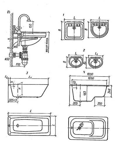 Основные технические характеристики санитарных приборов следующие: размеры, объем (вместимость), акустические показатели (частота и уровень шума, возникающего в процессе эксплуатации прибора), монтажное положение и взаимное расположение отдельных элементов (выпусков и переливов, водопроводной арматуры), химическая и термическая стойкость внутренней поверхности прибора, долговечность, надежность в работе, механическая прочность и эстетичность внешнего вида.