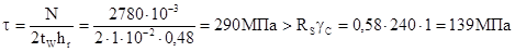 Так как стенка колонны тоньше примыкающих ребер (tw=10 мм< tr=25 мм), стенку проверяем на срез: