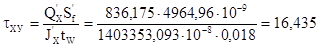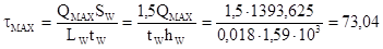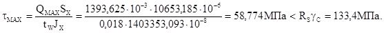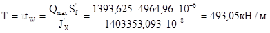 Недонапряжение – 1,98 % < 5 %, следовательно окончательно принимаем следующие размеры главной балки: Высота стенки главной балки hW=1590 мм, толщина стенки сечения tW=18 мм, ширина полки сечения bf=530 мм, толщина полки сечения tf=22 мм, высота покрытия по главной балке hП=682 мм, длина панели LБН=3700 мм, расход металла m=88,692 кг/м2, толщина настила принятого варианта tН=6 мм.2. Касательные напряжения (проверка стенки на срез).Касательные напряжения проверяются в стенке, в месте крепления опорного ребра без учета работы на срез полок.