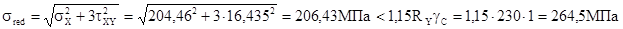 - приведенные напряжения в стенке под полкой: