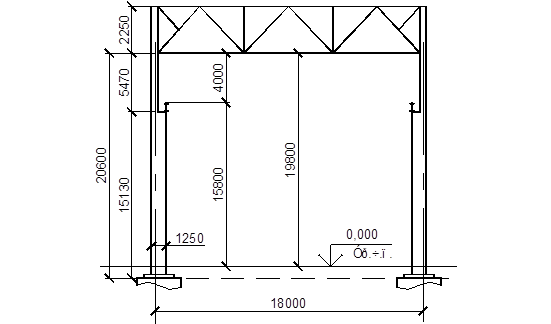ригель проходит по оси нижнего пояса фермы и принимается горизонтальным, т.к. уклон фермы менее 1/8.