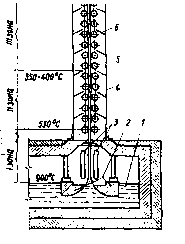 Рис.5.1. Машина вертикального вытягивания стекла: 1 – стекломасса; 2–лодочка; 3 – холодильники; 4 – шихта машины; 5 – тянущие валки; 6 – скаты для удаления боя; 7 – отломочная площадка.