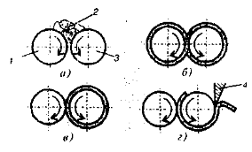 а – загрузка массы; б – вальцевание; в – переход массы на один валок; г – срез массы с валка; 1, 3 – валки; 2 – вальцуемый материал; 4 - нож
