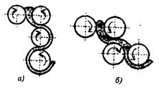 Рис.13.2. Схемы работы четырехвалковых каландров: